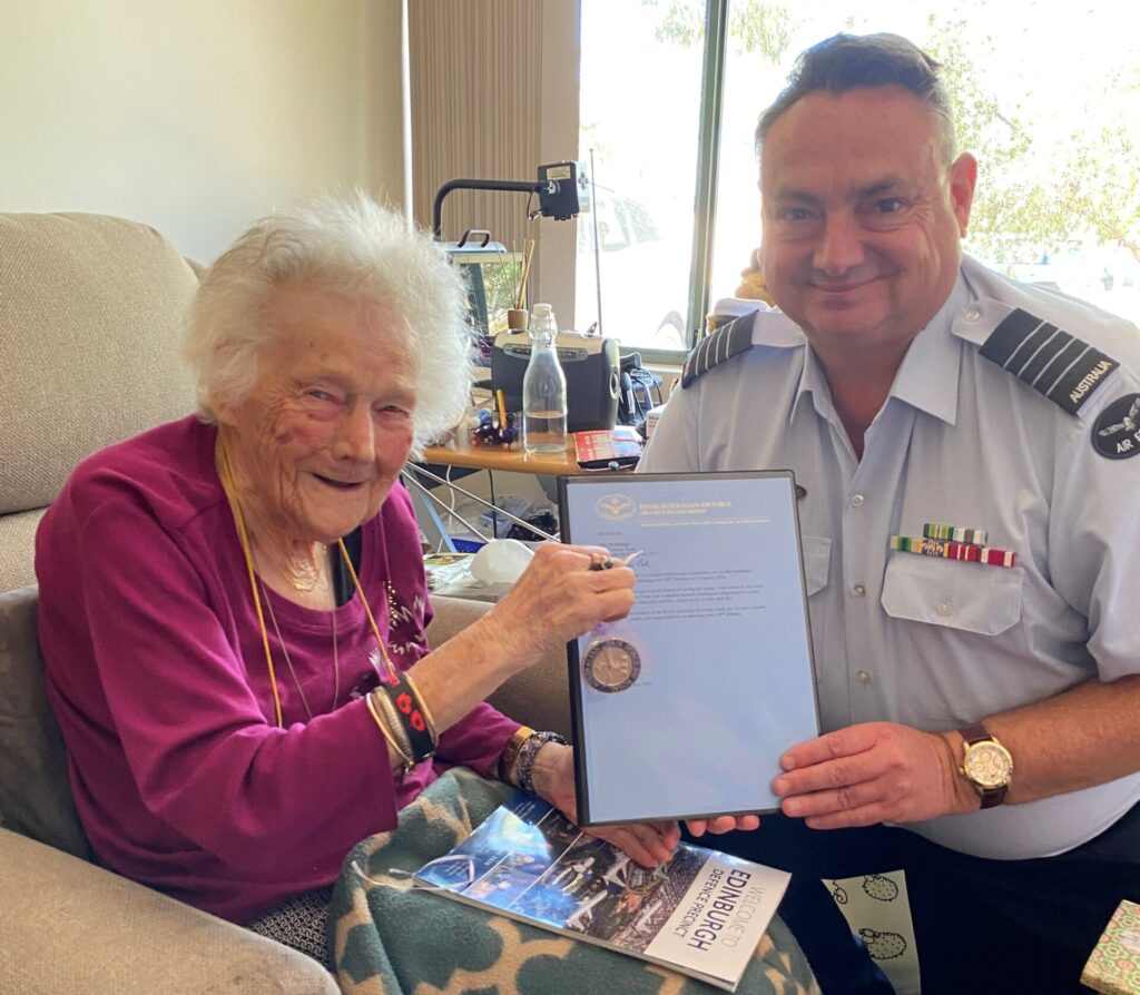 Caption:  WW2 WAAAF Veteran and Centenarian, Mona “Pat” Stringer with her Chief of Air Force Letter of Congratulations and Chief of Air Force Coin with RAAF Edinburgh Reservist and AFA-SA Vice-President, GPCAPT Greg Weller. (AFA-SA Image)