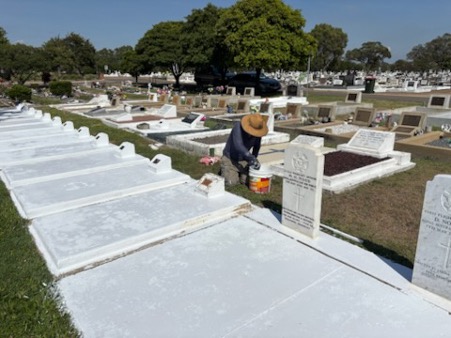 The team assembled for this work was Tony Jones (Project Leader), David Cowie, Mervyn Cowie (roped in by his father David as he was on holidays from Melbourne), Lindsay Gordon and Jeff Mustard.  The first stage of the project was to pressure wash the graves to remove any flaky paint or debris and took about three hours to complete. The pressure washers were loaned from the Townsville TPI Association and from branch member Jeff Mustard who supplied his own machine. To ensure the best paint results, the team had to wait until the concrete slabs at the graves were completely dry.
