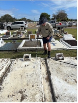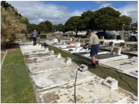 The team assembled for this work was Tony Jones (Project Leader), David Cowie, Mervyn Cowie (roped in by his father David as he was on holidays from Melbourne), Lindsay Gordon and Jeff Mustard.  The first stage of the project was to pressure wash the graves to remove any flaky paint or debris and took about three hours to complete. The pressure washers were loaned from the Townsville TPI Association and from branch member Jeff Mustard who supplied his own machine. To ensure the best paint results, the team had to wait until the concrete slabs at the graves were completely dry.